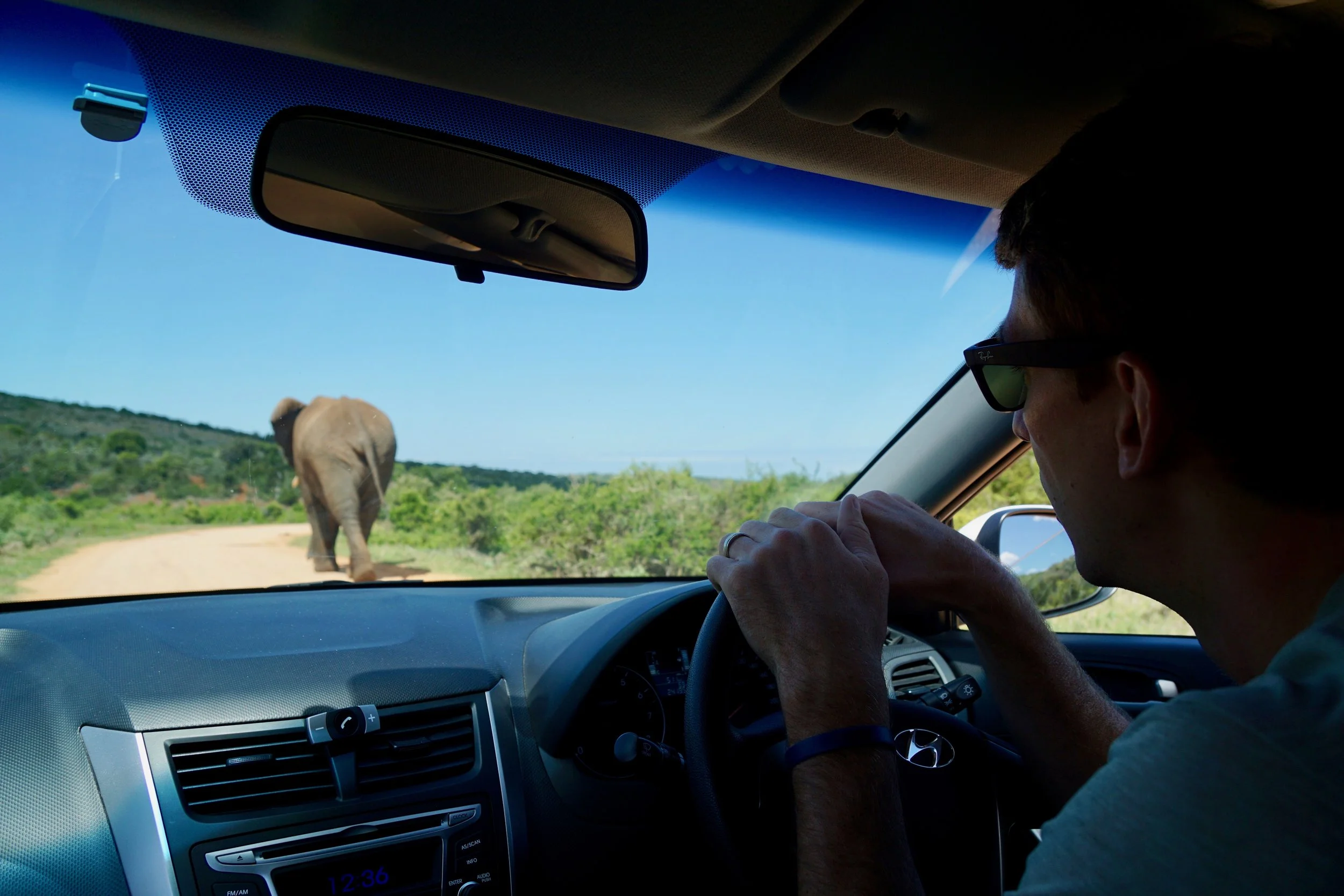 A 5-ton giant was coming towards us and my heart was racing. My face could only be described as mesmerized terror as I clenched the camera that was pointed nowhere near this beautiful African elephant. We were situated in the front seats of a four-cylinder white Hyundai, straight in the path of a bull elephant that was (only now do I realize) rather casually walking in our direction. We put ourselves here, Daniel surely more confident with adventure than I tend to be. Aside from my adrenaline, I was frozen thinking that all this big guy had to do was lift a foot and the front of our car would be smashed, making us a couple of tourists stuck in a wilderness of wild lions, elephants, warthogs, and rhinos. We were at the mercy of the world’s largest land animal and Daniel's ability to react quickly while operating a right-side driver (aka left-hand stick) vehicle, which I guarantee I would stall in a second.
